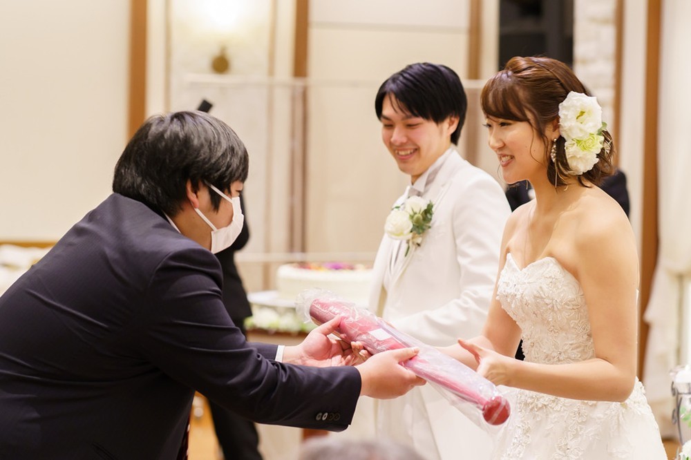 披露宴の結びにはおふたりから親御様へ、花束と記念品の感謝状が贈られました。