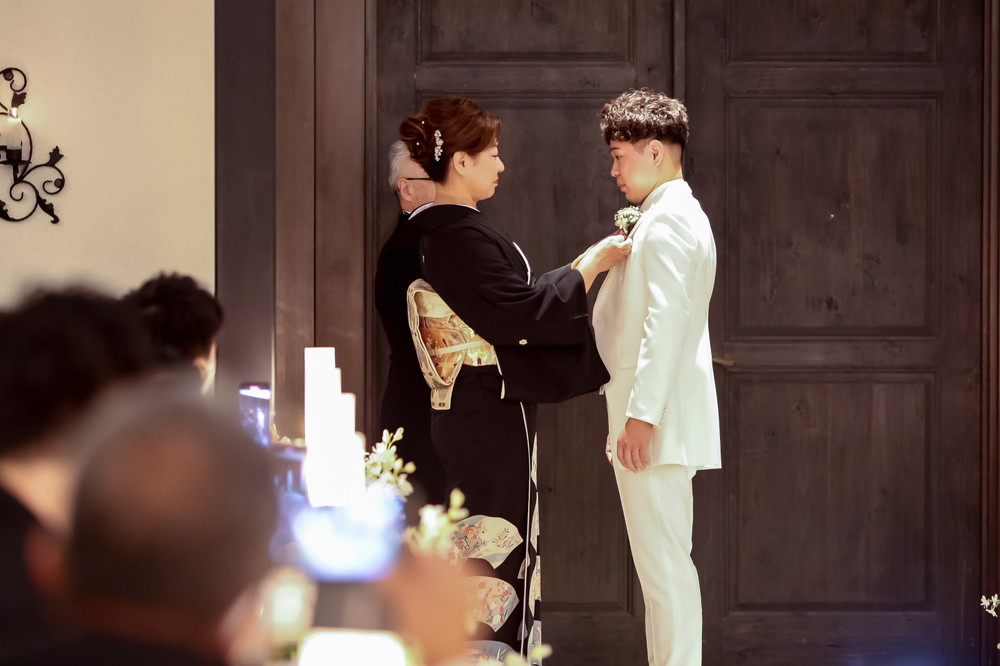 お父様によるジャケットセレモニーと、お母様からのブートニアの演出を経て、
