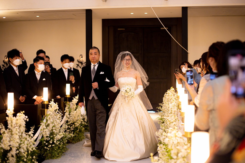 挙式では緊張の面持ちだったおふたりも、披露宴入場の際にはリラックスされ、