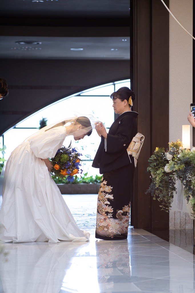 お母様にベールダウンをしていただき、再びお父様とともにバージンロードを歩まれました。