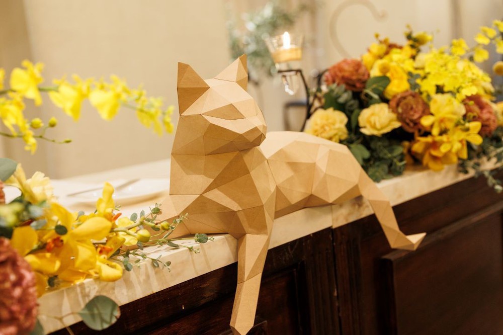 てんてん様がクラフトペーパーで手作りされたオブジェの猫は、ウェルカムスペースや披露宴会場の高砂席に飾られました。