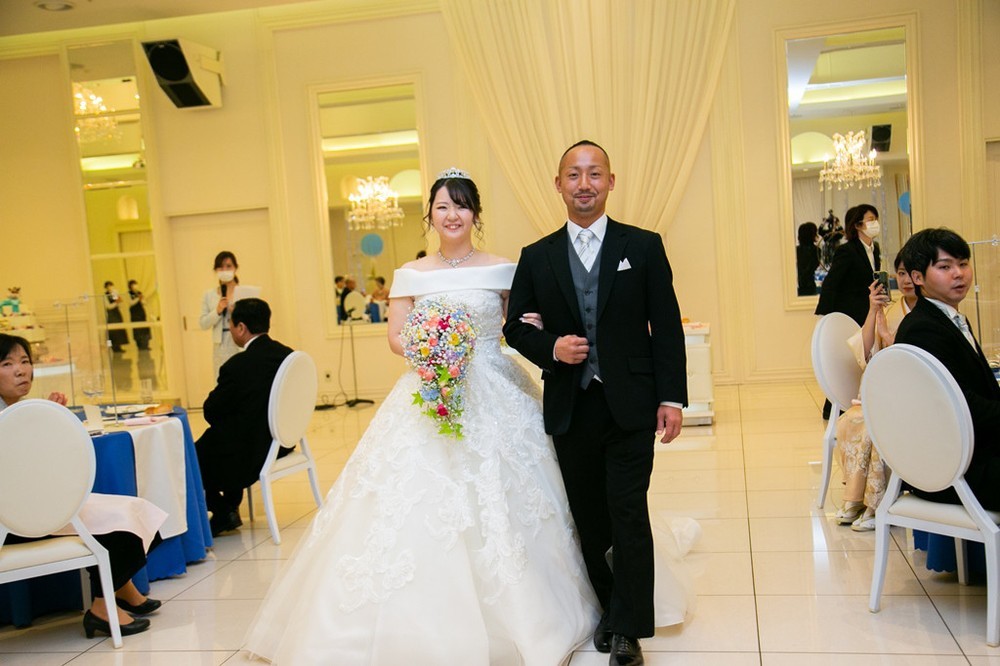 退場時には、とびっきりの笑顔でその祝福に応えたおふたり。