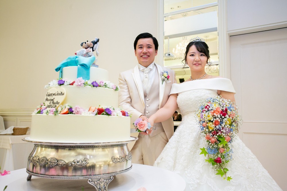 ウエディングケーキにはおふたりが手配なさった、ウエディングドレスとタキシードを着たミッキー&ミニーのトッパーがあしらわれ、ゲストの皆様から「カワイイ!」「すごい!」の声が上がっていました。