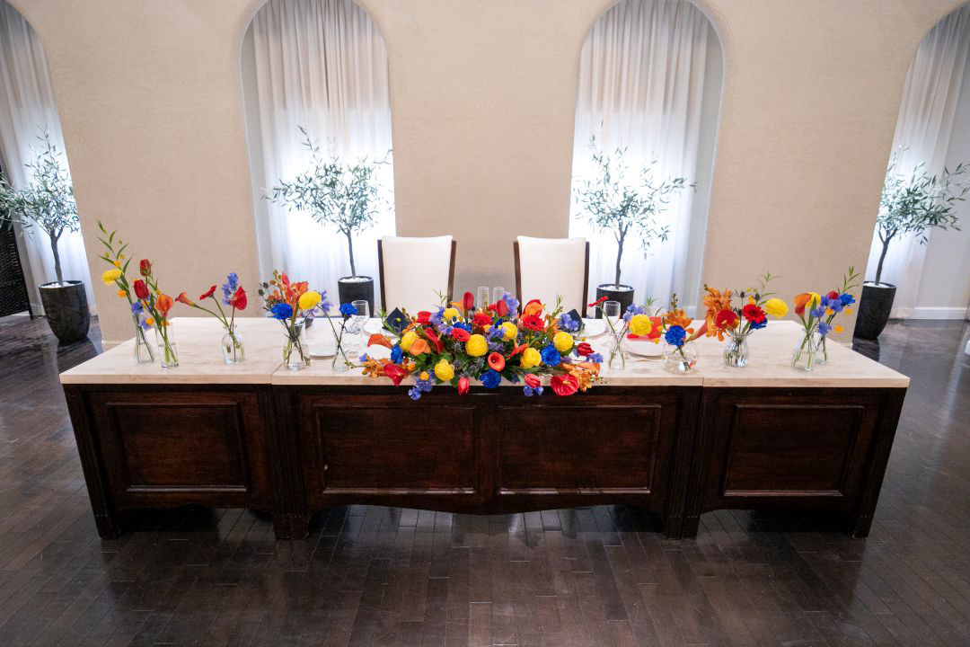 会場内のコーディネートも、テーマカラーの「テラコッタ&ターコイズブルー」に合わせ
